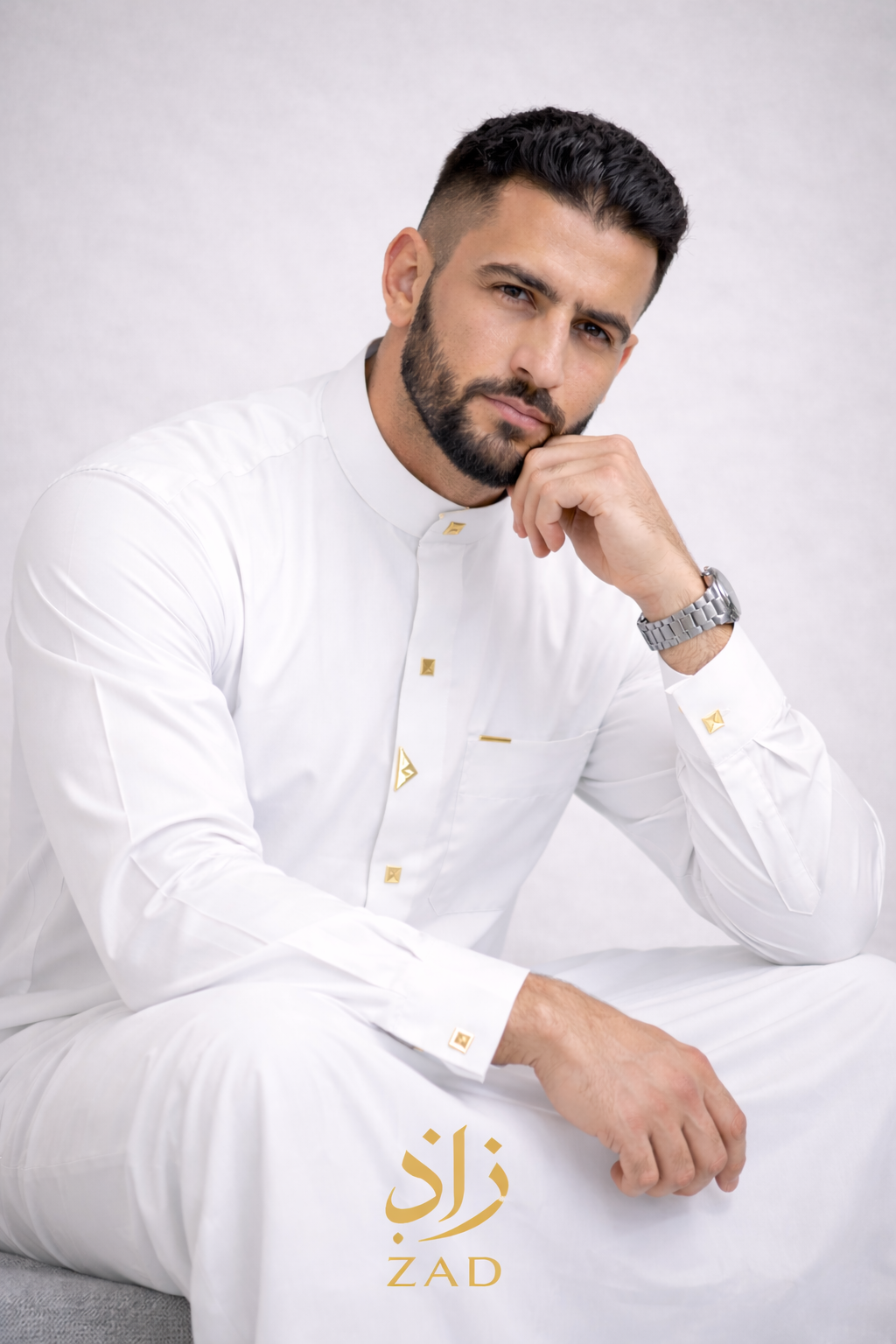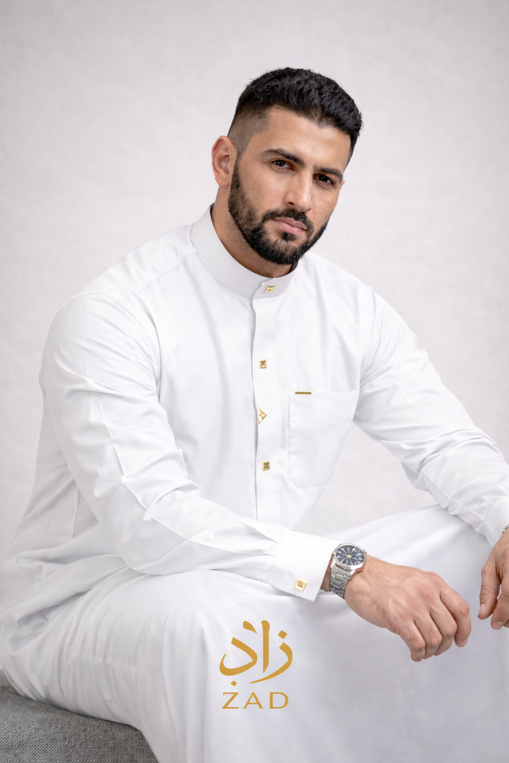يأتي الثوب مزوّداً بسحّاب مخفي أنيق، وأزرار عملية في الأكمام لإطلالة أكثر تميزاً ورقياً.